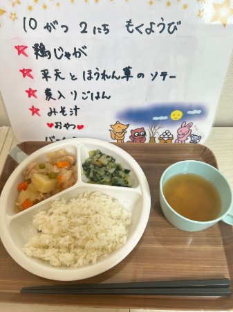乳児にはミルクや離乳食など年齢に応じた献立を考えます。
